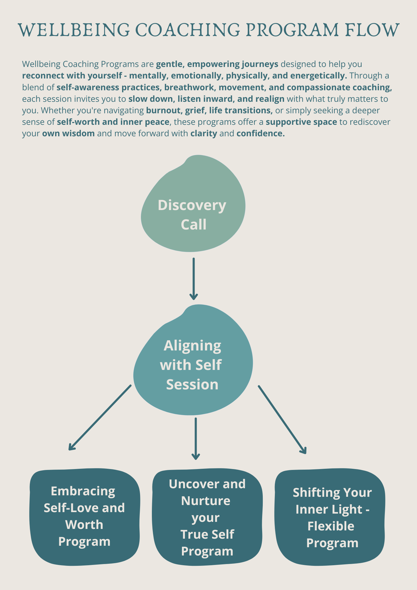 Embrace your journey with my Flexible Coaching sessions. Tailored to support your unique path, this program offers personalized guidance as you explore and understand different facets of yourself. We will explore various strategies and delve into understanding yourself more. Each session is designed to adapt to your needs, allowing you to move at your own pace towards greater self-awareness, building self-worth and inviting love and joy into your life.